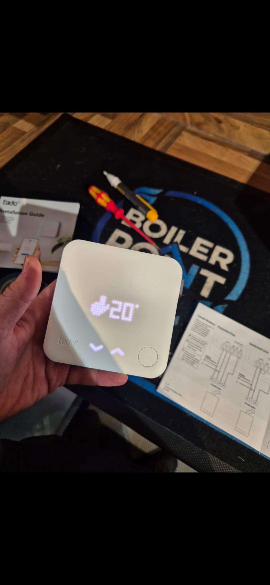 The engineer connects the new smart thermostat, handling any necessary adapters, rewiring, or integration with radiators and heating controls.